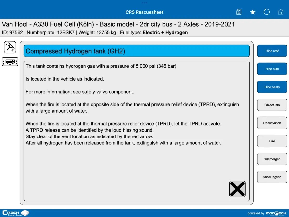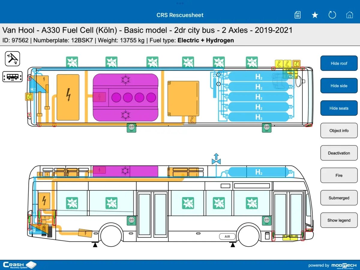 Ved hjælp af de vigtige oplysninger under deaktiveringsknappen i bussens interaktive redningsark kunne redningsmandskabet begynde at immobilisere køretøjet og frakoble højspændingskredsløbet. Da alle sikkerhedsrelaterede komponenter også var klikbare i Crash Recovery System, havde redningsmandskabet adgang til yderligere oplysninger om de komprimerede brinttanke og brintudluftningen.